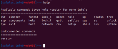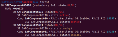 • forest: Display the cluster topology and summary information for SG, Node, SU, SI, and other components. Use this to get an at-a-glance view of the cluster structure.