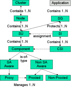 Clusters serve as the logical grouping for system components and services. Each cluster contains one or more nodes. Nodes contain Service Units (SUs). SU is an aggregation of one or more components that are managed together to provide a service. SG is a collection of service units (SUs) of the same type that collectively provide service availability for one or more service instances. SI is an aggregation of various CSIs that can be assigned to the components in the SU.